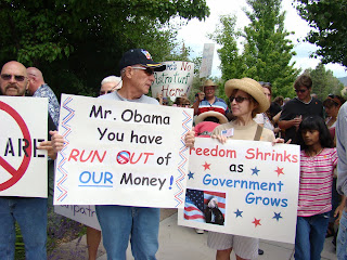 The heckler, a middle-aged man, seemed angry to the point of tears as he was escorted out of the crowd by a Tea Party volunteer. He tried to talk to several of us, but another gentleman calmy but firmly told him, "I see your passion, but we want to hear the speech. The young lady has the floor."
